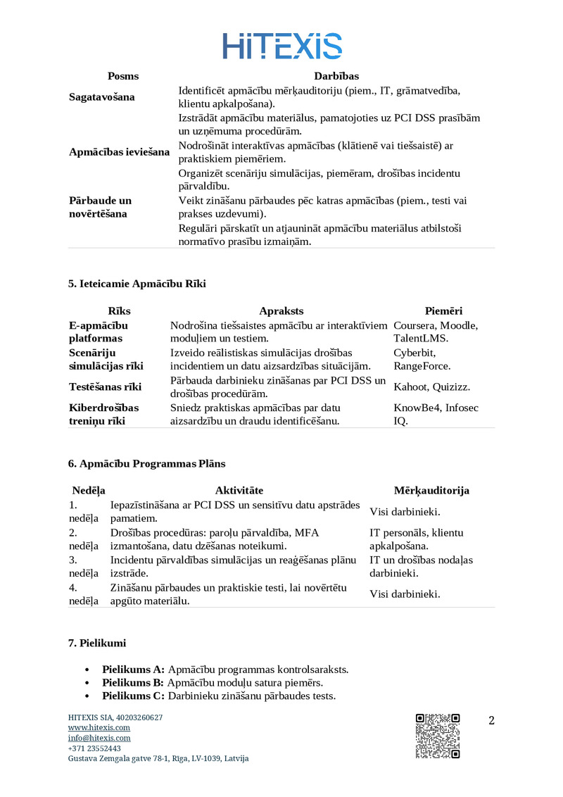 Darbinieku apmācība ir būtiska, lai nodrošinātu PCI DSS prasību ievērošanu un drošības procedūru izpratni visā organizācijā. Šis dokuments piedāvā vadlīnijas un ieteikumus apmācību programmu izstrādei un ieviešanai, lai uzlabotu darbinieku zināšanas un spēju novērst drošības incidentus.