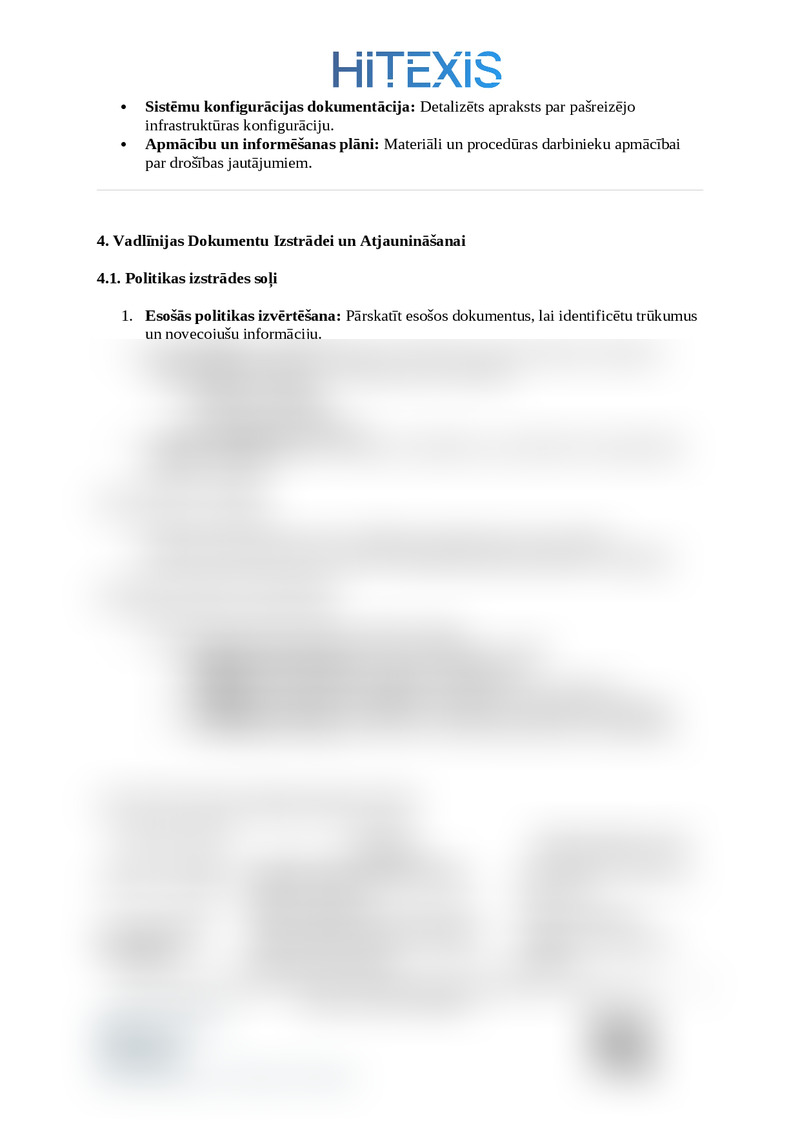 | Apraksts | Drošības dokumentācija ir būtisks uzņēmuma datu un sistēmu aizsardzības elements. Šajā dokumentā tiek piedāvātas vadlīnijas drošības politiku, procedūru un citu dokumentu izstrādei vai atjaunināšanai, lai nodrošinātu atbilstību PCI DSS prasībām un vispārēju kiberdrošības pārvaldību. | Šīs fails pastāv tikai priekš PowerPoint aizmiglošanas piemēra | Darbinieku apmācība ir būtiska, lai nodrošinātu PCI DSS prasību ievērošanu un drošības procedūru izpratni visā organizācijā. Šis dokuments piedāvā vadlīnijas un ieteikumus apmācību programmu izstrādei un ieviešanai, lai uzlabotu darbinieku zināšanas un spēju novērst drošības incidentus. | Instrukcija ir lejupieladējamā .docx formāta datne, kurā atļauta redeģēšana. | Šis dokuments apraksta esošo informācijas drošības praksi un tās salīdzinājumu ar ISO 27001 standarta prasībām. Atbilstības novērtējuma mērķis ir identificēt atšķirības (Gap Analysis) starp pašreizējo situāciju un nepieciešamajām prasībām, sniedzot konsultācijas par nepieciešamajiem uzlabojumiem. | |