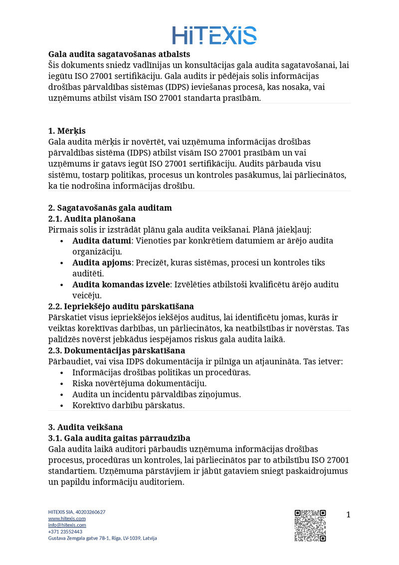 Šis dokuments sniedz vadlīnijas un konsultācijas gala audita sagatavošanai, lai iegūtu ISO 27001 sertifikāciju. Gala audits ir pēdējais solis informācijas drošības pārvaldības sistēmas (IDPS) ieviešanas procesā, kas nosaka, vai uzņēmums atbilst visām ISO 27001 standarta prasībām.