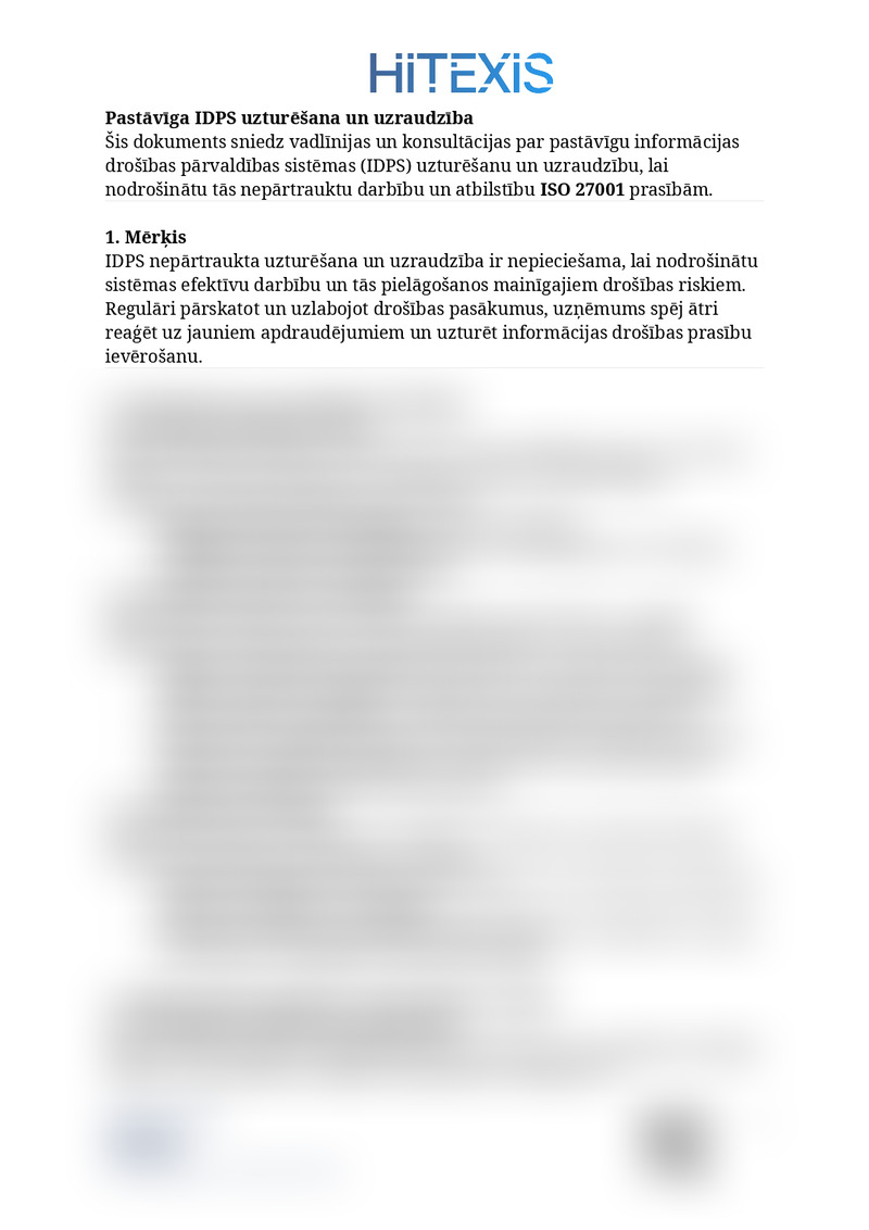 Šis dokuments sniedz vadlīnijas un konsultācijas par pastāvīgu informācijas drošības pārvaldības sistēmas (IDPS) uzturēšanu un uzraudzību, lai nodrošinātu tās nepārtrauktu darbību un atbilstību ISO 27001 prasībām.